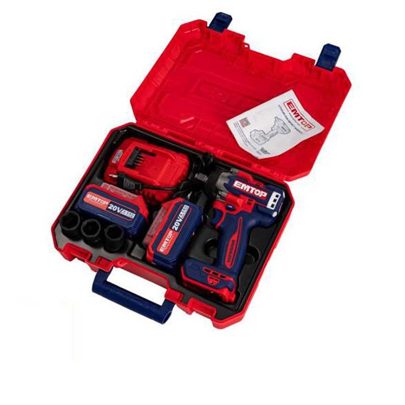 Clé à choc EMTOP 20V Brushless 500Nm avec 2 batteries 4Ah. Idéale pour les travaux intensifs, la mécanique auto et le chantier. Puissante, autonome et professionnelle.