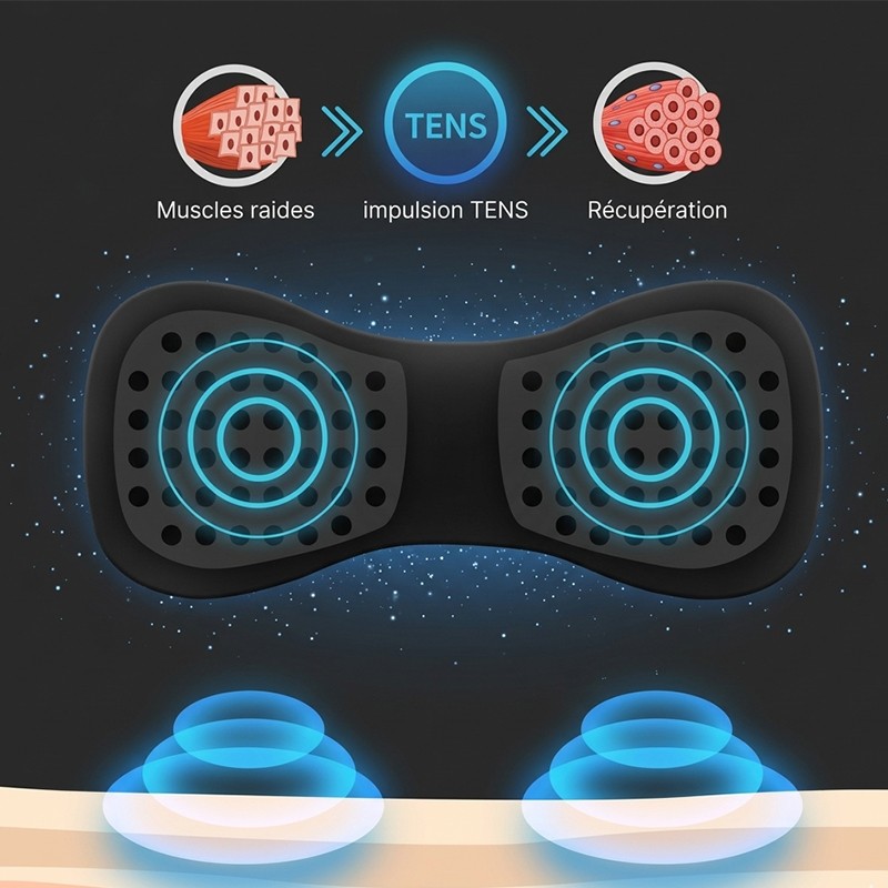 Conseil d’utilisation : fixez le patch de gel sur la zone ciblée, allumez l’appareil et choisissez le mode qui vous convient pour un massage doux ou plus profond.