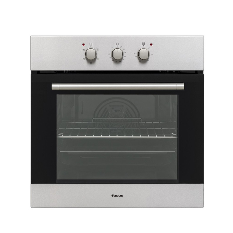 Four encastrable FOCUS F525X de 56 L avec 6 programmes de cuisson, chaleur tournante pour une cuisson homogène, minuterie mécanique, porte froide sécurisée, design inox, classe énergétique B et garantie 2 ans.