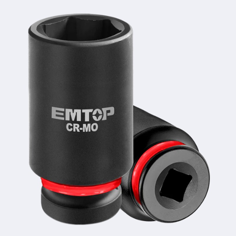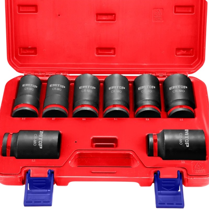 Jeu de 8 douilles EMTOP 3/4″ (26–38 mm) en acier Cr-Mo, idéal pour les travaux intensifs. Robustes, longues (90 mm) et compatibles avec clés à choc professionnelles.