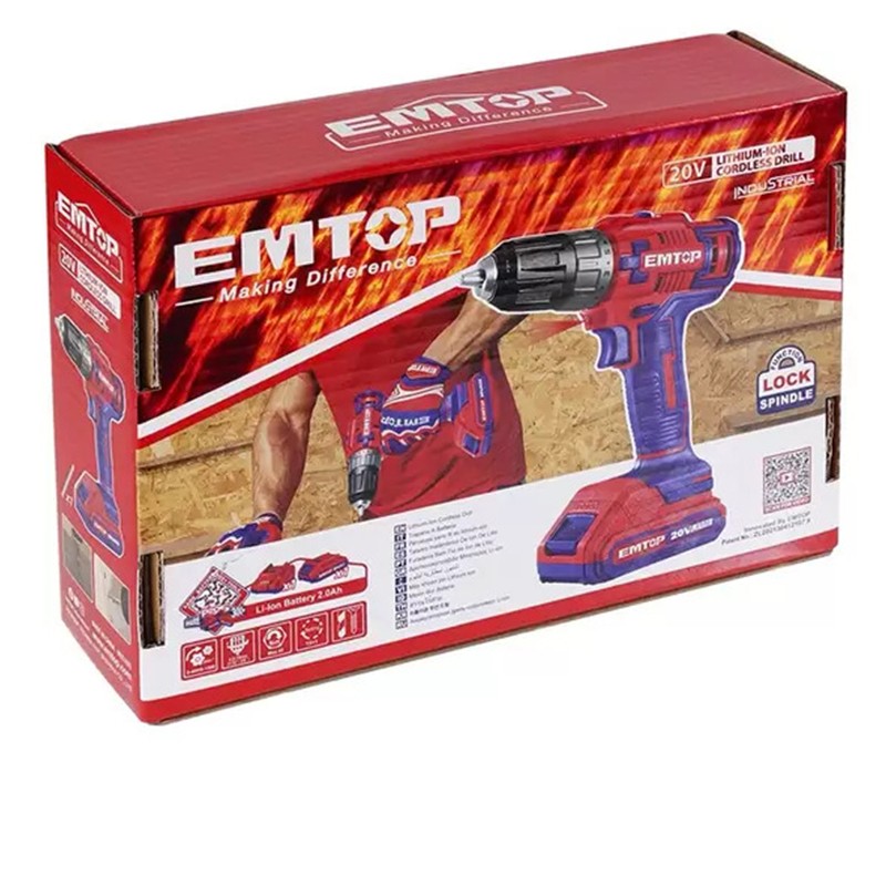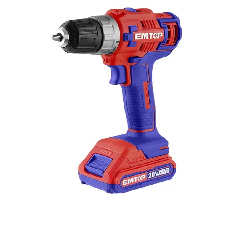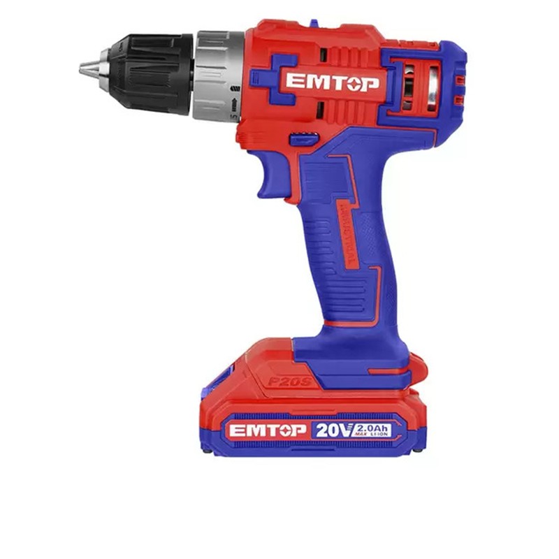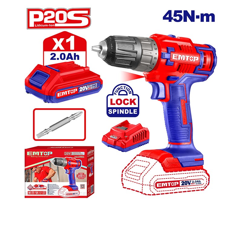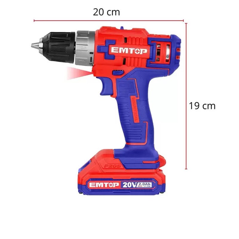 Fonctionnant avec une batterie lithium 20V 2.0Ah, cette perceuse offre une bonne autonomie pour les travaux quotidiens. Elle est compatible avec toute la gamme EMTOP 20V, permettant d’utiliser la même batterie sur plusieurs outils.