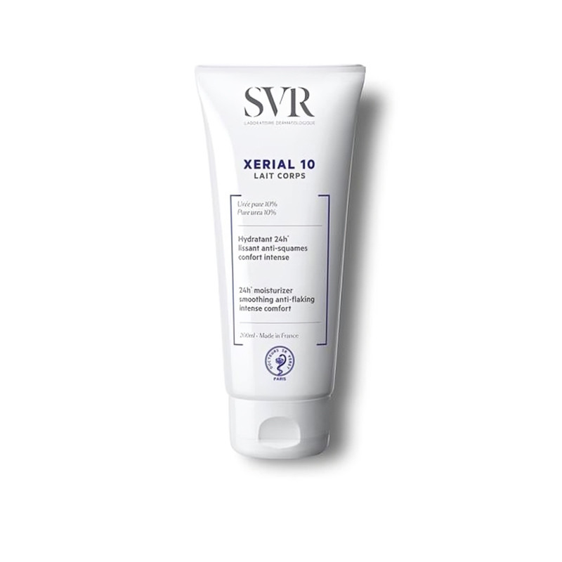 Le SVR Xerial 10 Lait Corps est un soin corporel conçu pour les peaux sèches, rugueuses ou squameuses, adultes comme enfants (dès 3 ans). Grâce à sa formule enrichie en 10 % d’urée pure brevetée, il agit comme un traitement émollient et kératolytique, aidant à éliminer les cellules mortes, lisser la peau et réduire efficacement les squames, rugosités et tiraillements.